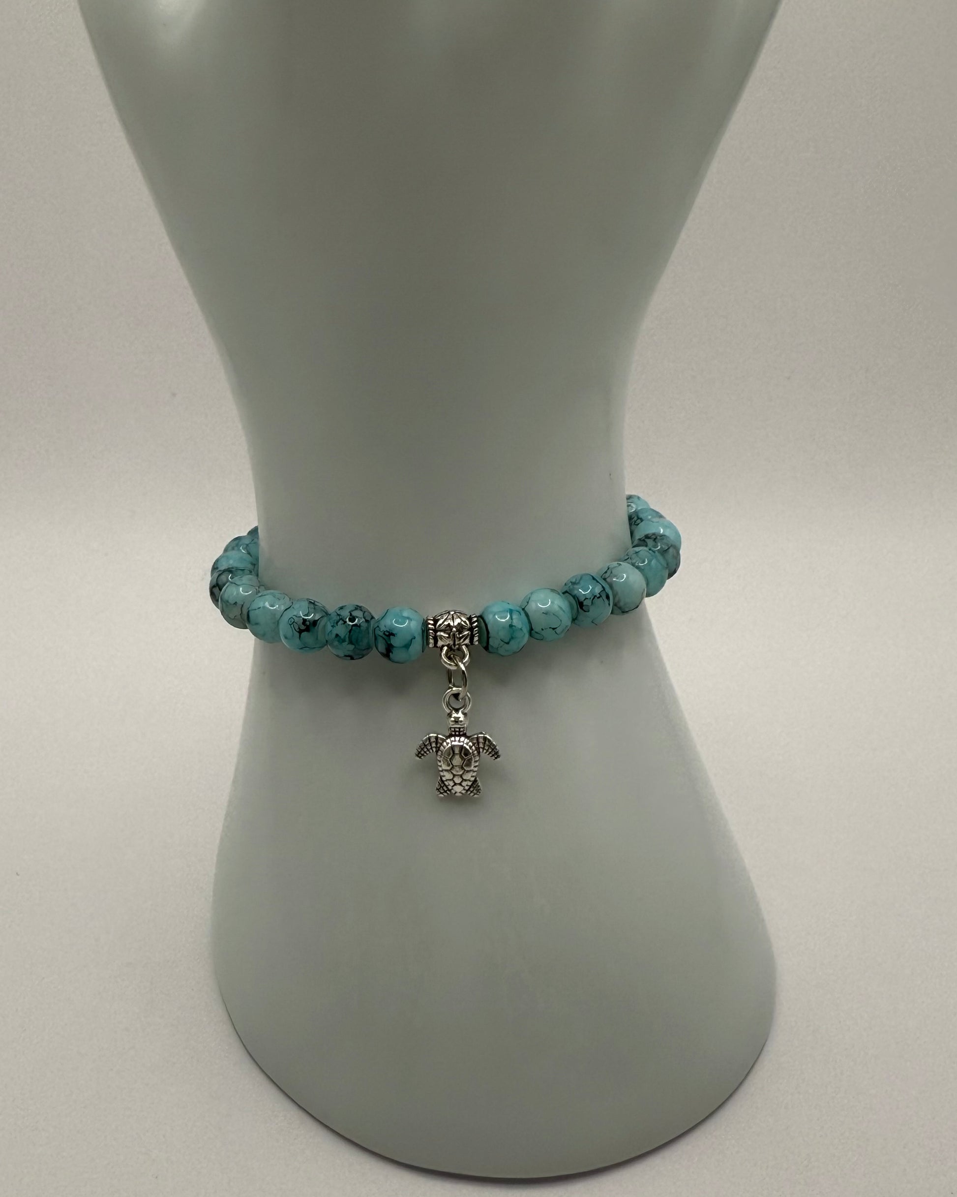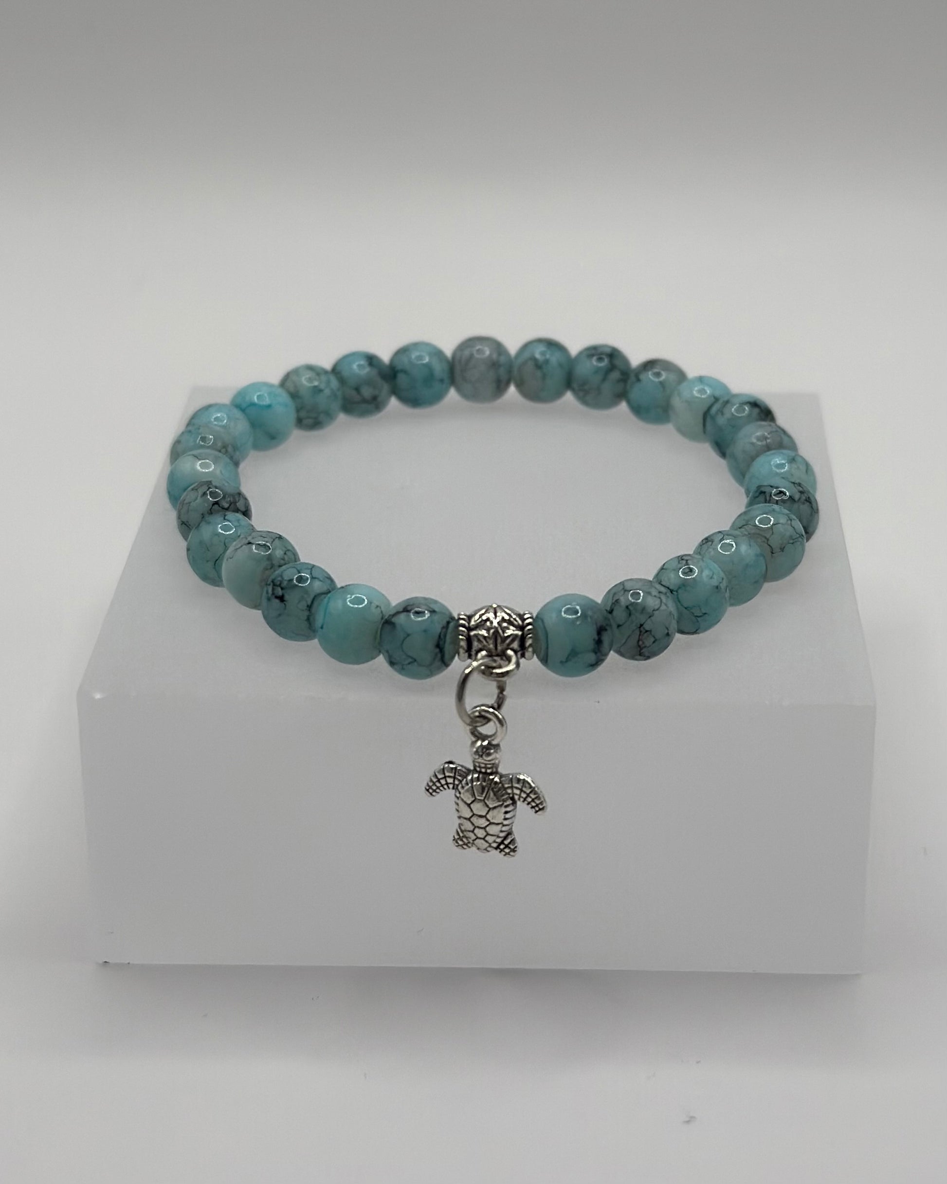 Our Turtle Charm Bracelet brings serene, ocean-inspired beauty to your jewelry collection. Featuring marbled turquoise beads and a finely detailed silver turtle charm, this bracelet is a symbol of tranquility, strength, and a love for the sea. 🌊🐢