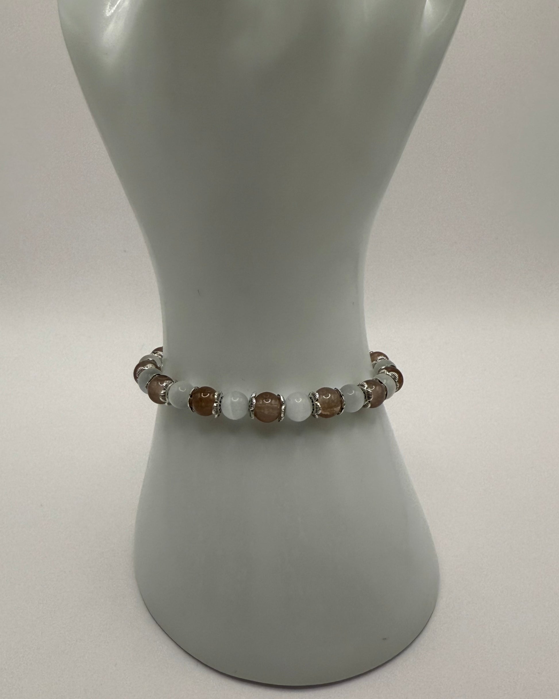 Bring balance and beauty to your everyday style with my handcrafted beaded bracelet. Featuring a soothing mix of warm, earthy brown and luminous white stones, this piece blends grounding energy with serene elegance. Each bead is separated by intricately designed silver-toned spacers, adding a refined touch that makes this bracelet perfect for both casual wear and more polished outfits.
