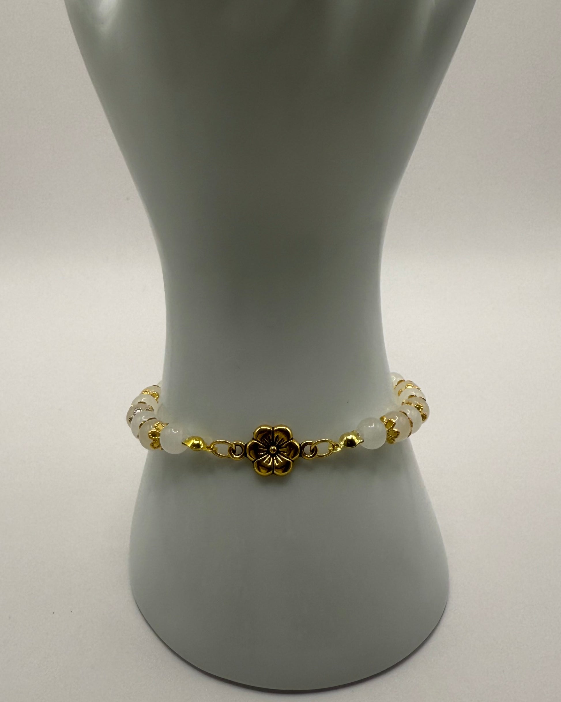 Add a touch of elegance to your everyday look with this beautifully handcrafted bracelet featuring smooth white beads, delicate gold-toned spacers, and a stunning central flower charm. The harmonious blend of white and gold exudes sophistication and serenity, making it a versatile accessory that complements both casual and formal outfits.