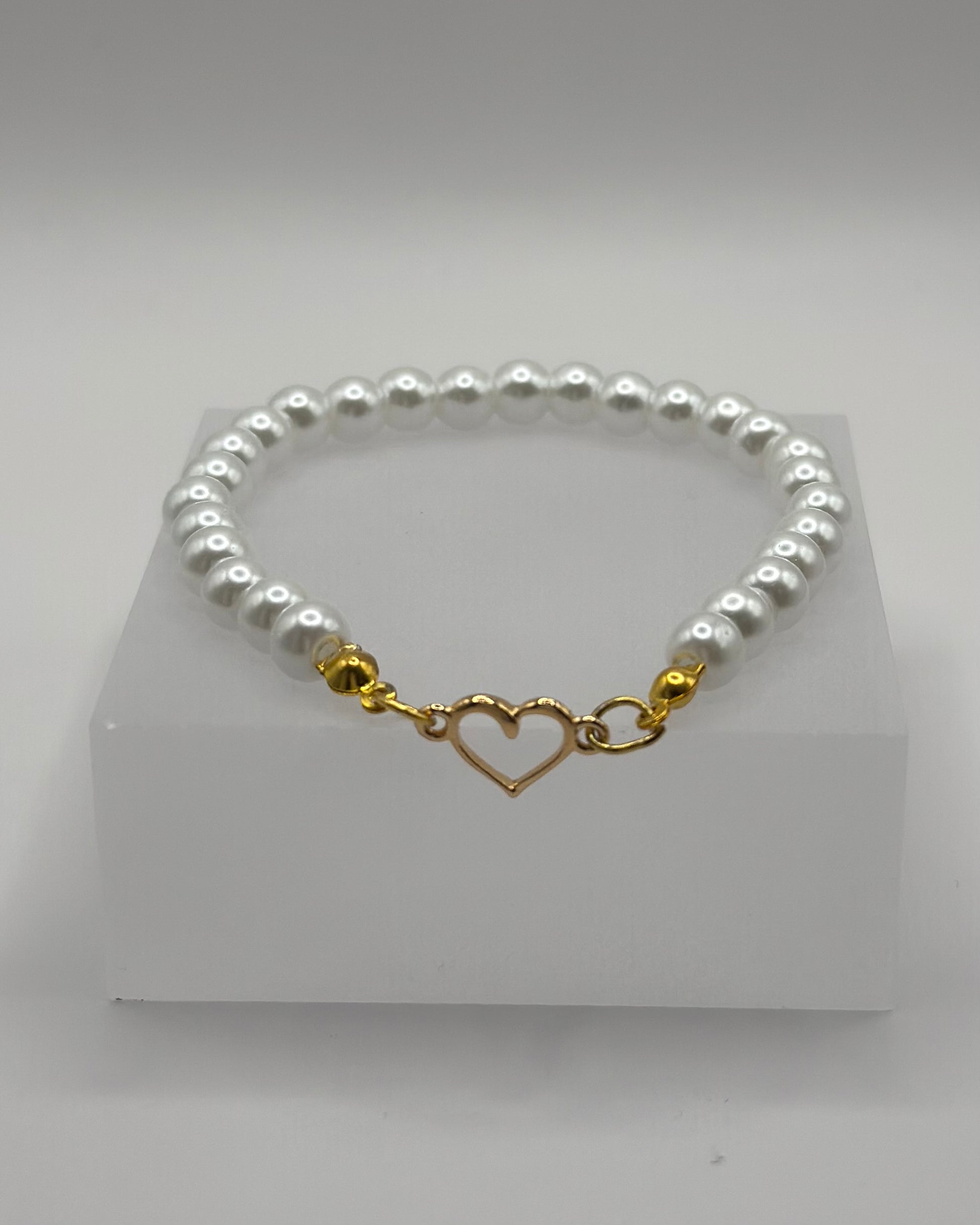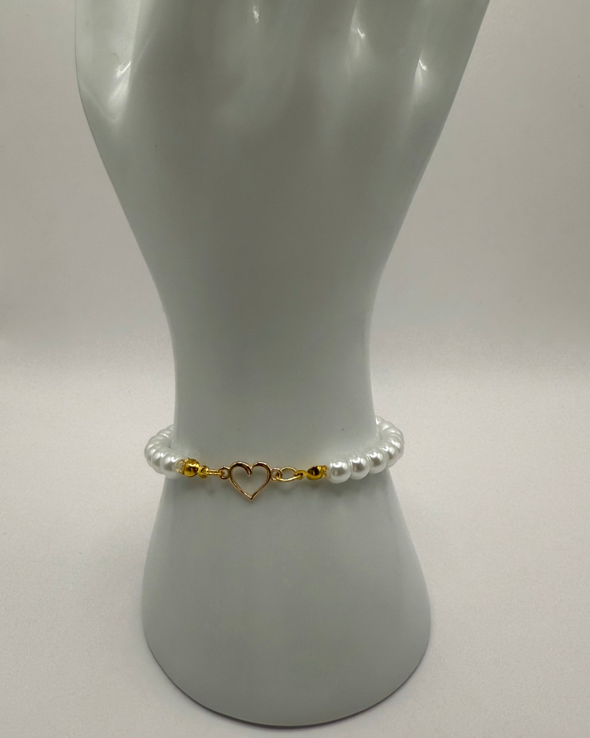 Our pearlbracelet is a graceful blend of classic charm and romantic detail. Featuring glossy white faux pearls and a delicate gold heart centerpiece, this bracelet adds a touch of sophistication to any outfit.