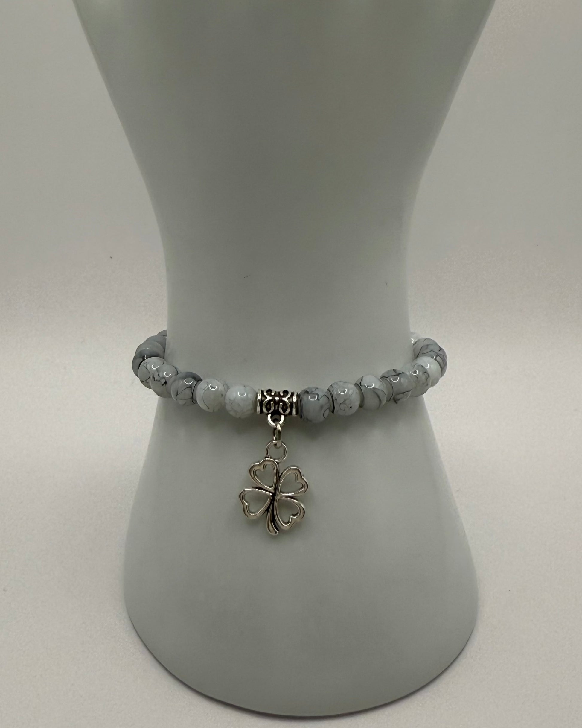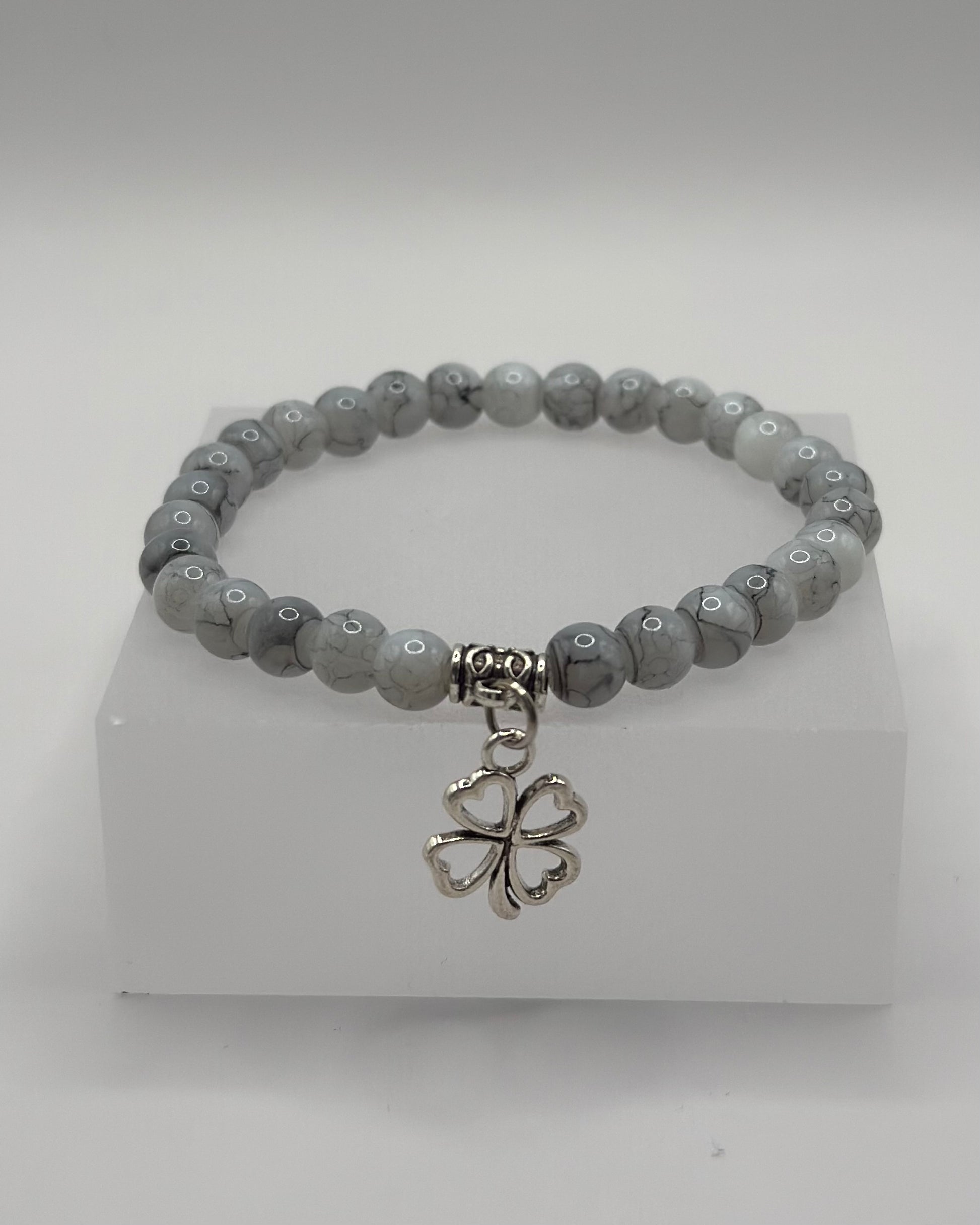 Our Silver Clover Bracelet is a graceful symbol of luck and charm. Made with elegant marbled grey beads and a dainty four-leaf clover charm, this piece is perfect for adding a subtle yet meaningful touch to your everyday look.